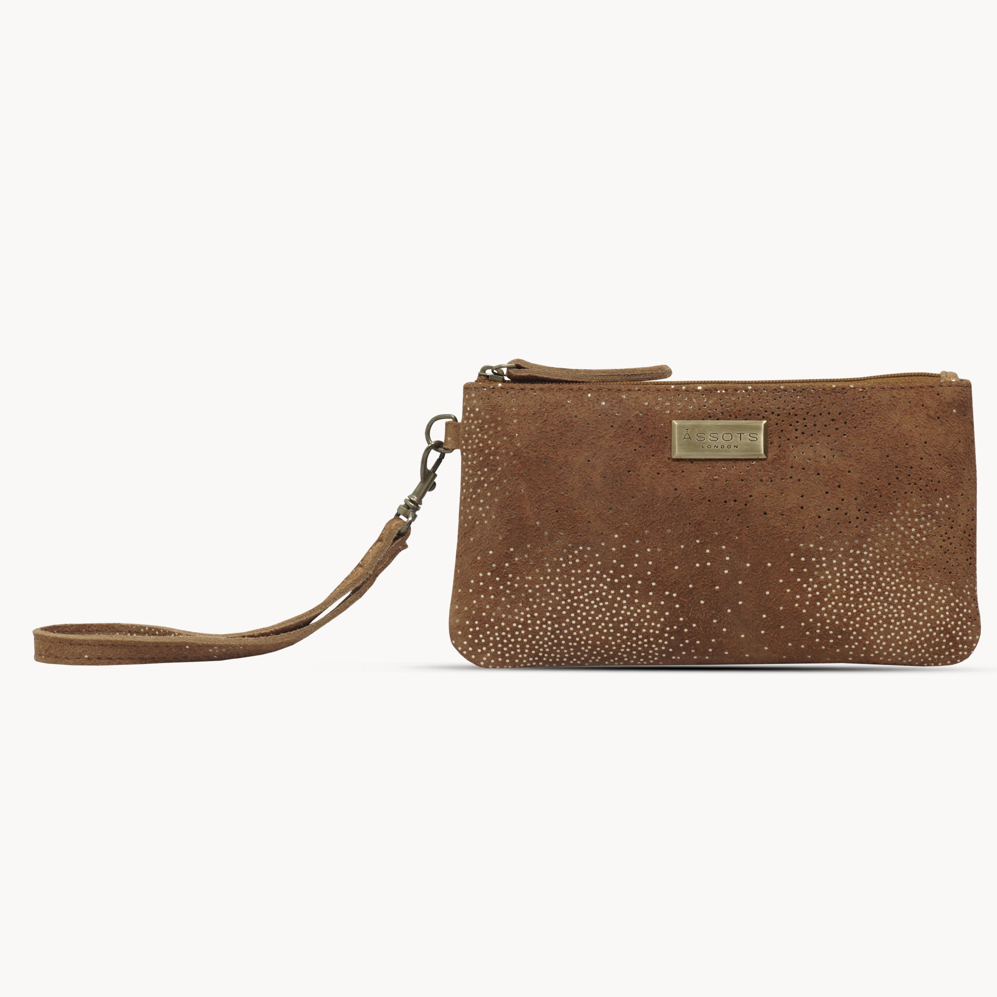 'KAREN' Tan Suede Leather with Yellow Gold Embellishment Wristlet Clutch Bag