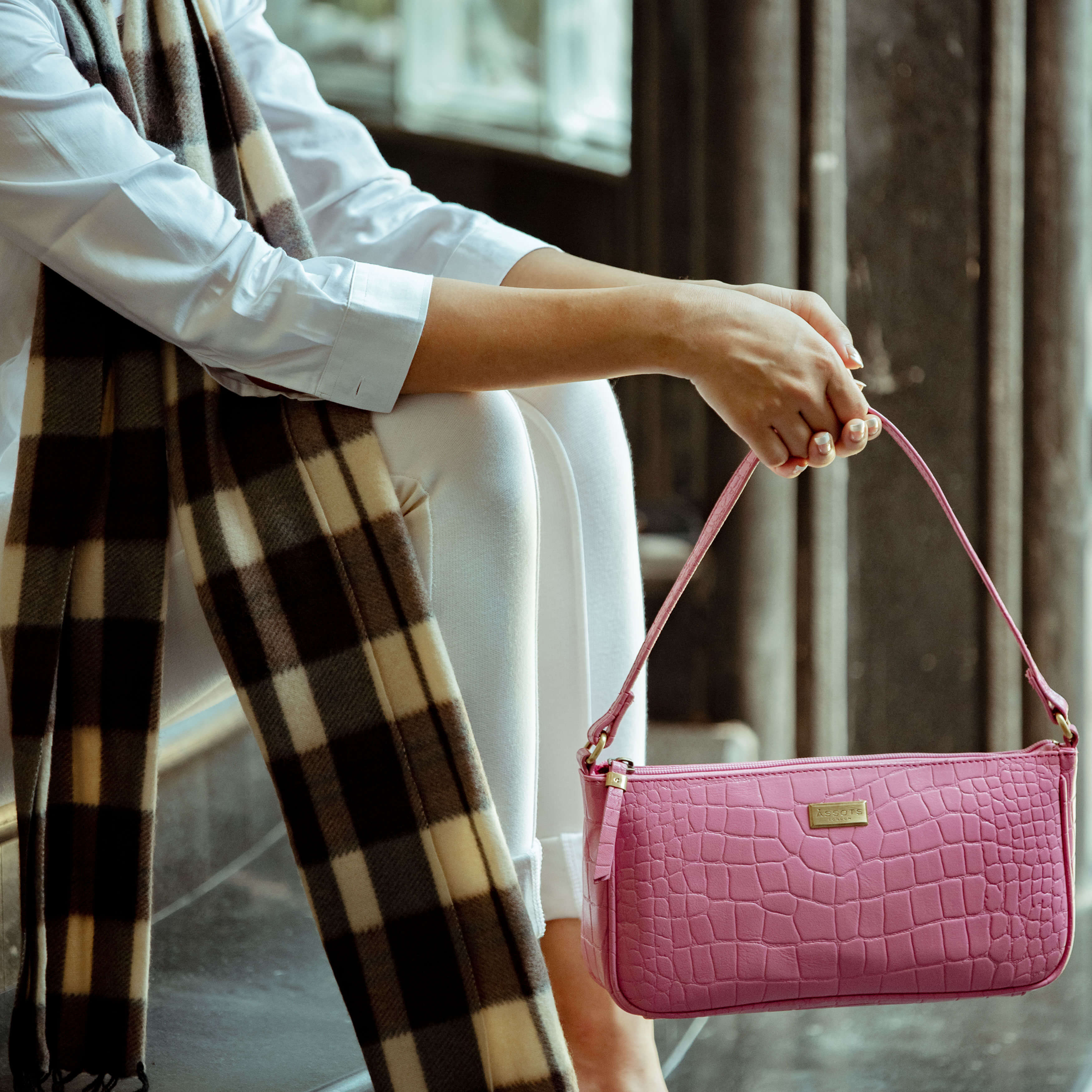 Sold out 'ZARA' Pink Designer Croc Real Leather Baguette Shoulder Bag'ZARA' Pink Designer Croc Real Leather Baguette Shoulder Bag